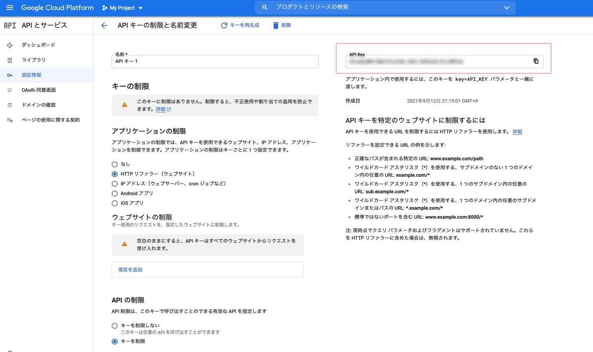 簡単な説明になりますが、認証情報でAPI Keyを生成します。 赤い枠に表示されているAPI Keyをコピーします。