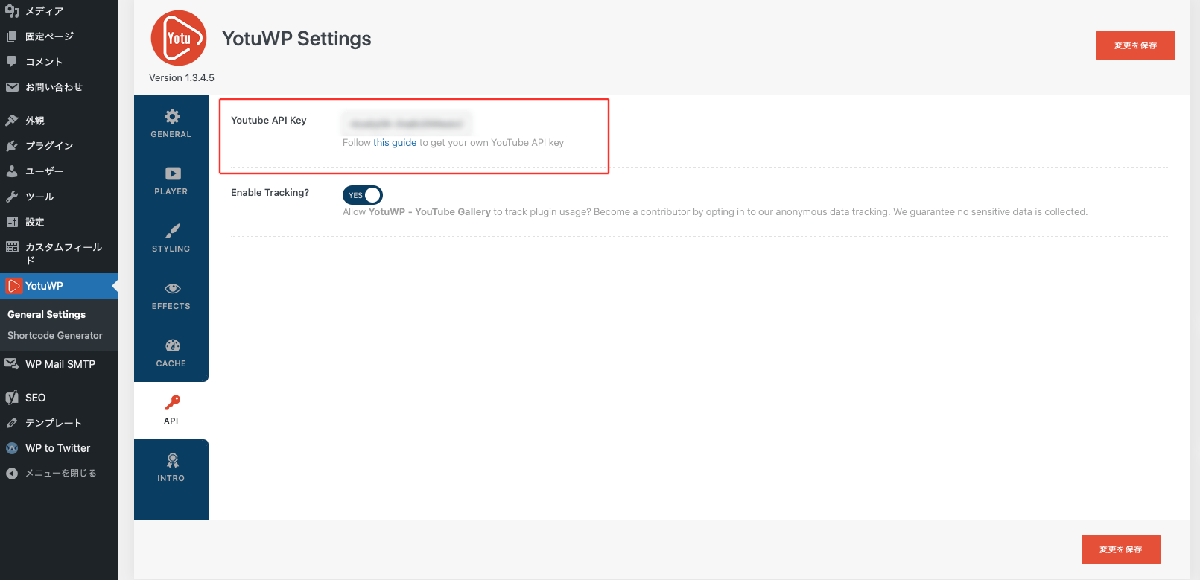 YotuWPをインストールし有効化すると管理画面のメニューに「YotuWP」が追加されます。 General Settingへ進み、先ほどコピーしたAPI Keyを貼り付けて保存してください。