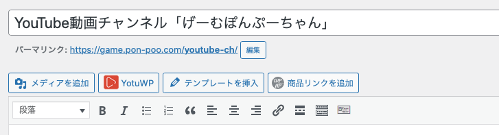 YotuWPのメニューShortcode Generateか、下記のようにエディタにも表示されるボタンからショートコードを作成します。